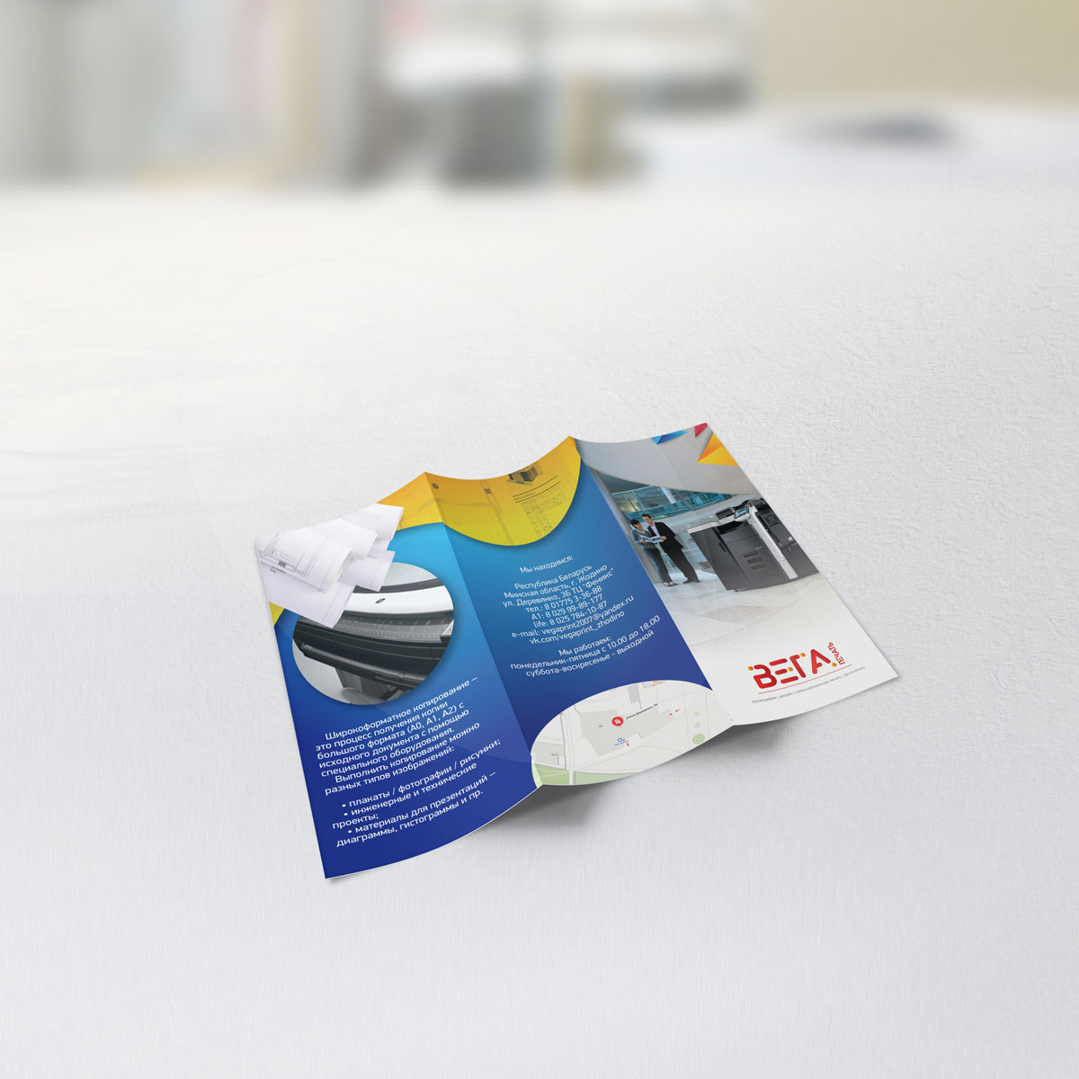 Лифлет — двухсторонний лист. Обычно с двумя или тремя сгибами. Его складывают различными способами: пополам, гармошкой и т. д. Наиболее популярный формат рекламного буклета. Такой стандартный рекламный буклет еще называют евробуклетом (лист А4 с двумя сгибами)