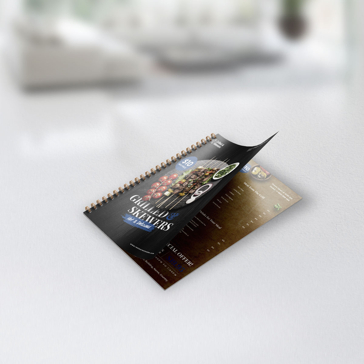 Меню на пружине обычно используют для сезонных предложений и карты напитков, а также для основного ассортимента в кафе. Пружина позволяет раскрыть меню так, чтобы обложка полностью лежала на столе, и ее можно было не придерживать.