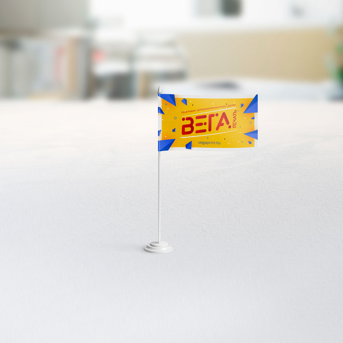 Настольные тканевые флажки - такие флажки, выполненные на тканевой основе (атлас, флажный шелк), могут содержать любую графическую информацию: логотип организации, рекламный слоган и т. д. Настольные флажки обычно крепятся на настольную подставку.